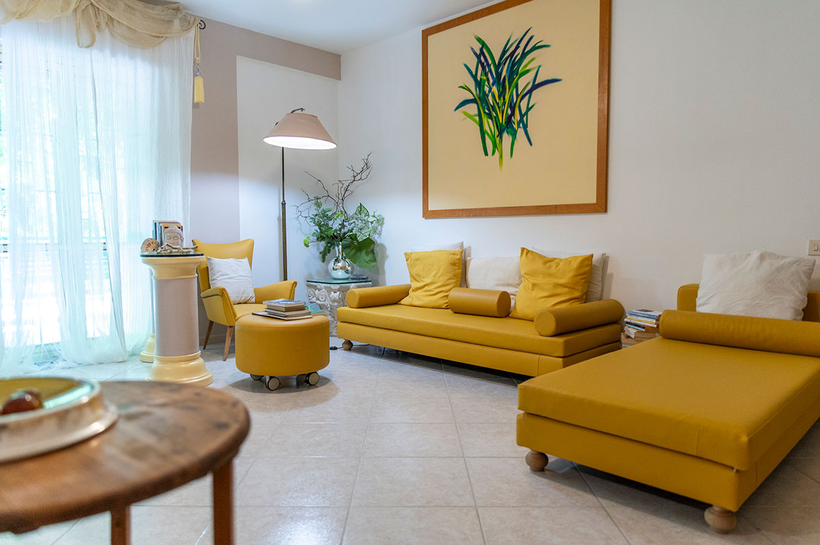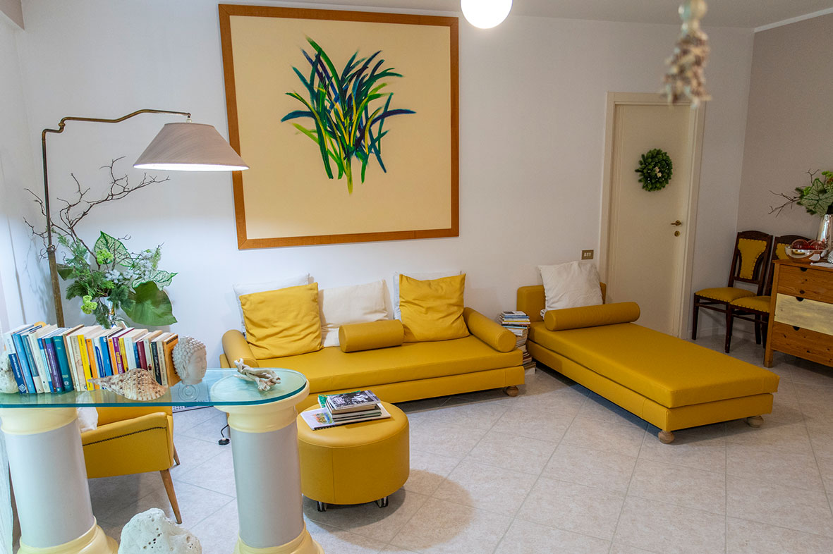 Poco distante dal centro, nella periferia di Recanati, la mia casa è al piano terra di un condominio. La rende particolare il gioco dei tenui colori nell’arredo che creano un ambiente rilassante.